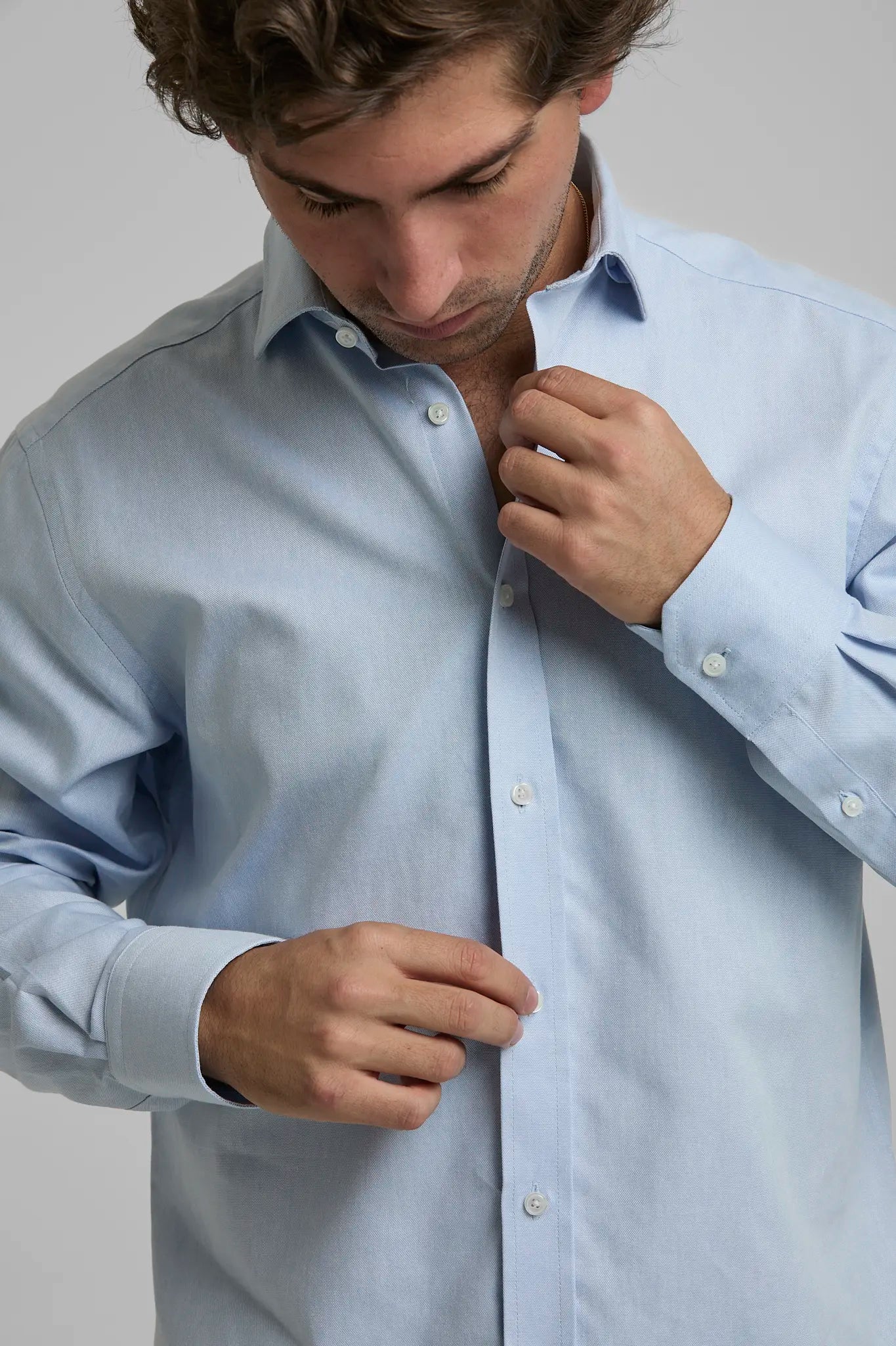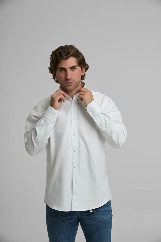 En algodón Oxford, una tela con ese peso justo que se siente bien desde el primer uso.