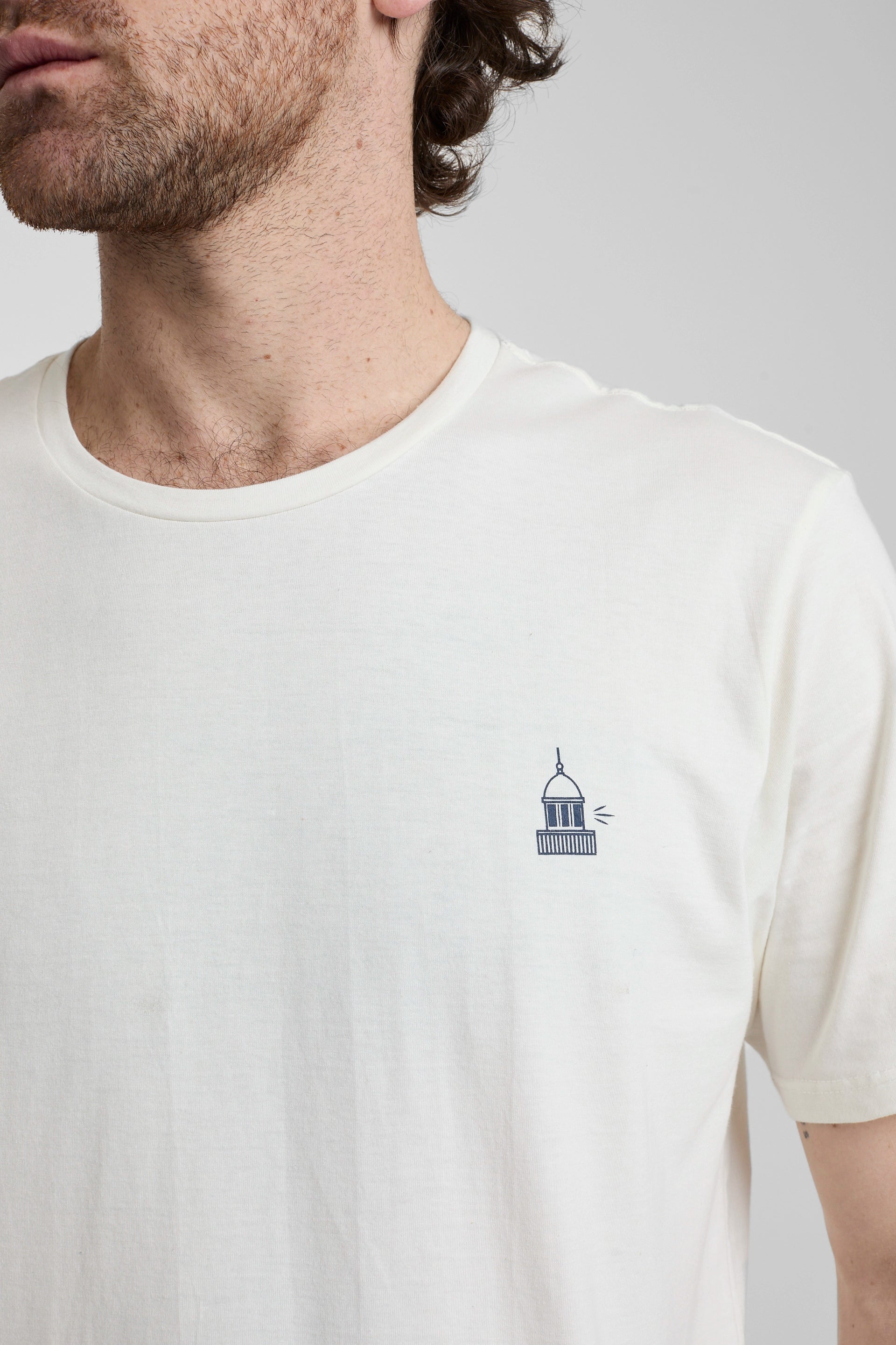Camiseta cuello redondo color crudo con estampado en serigrafía en espalda y pecho.