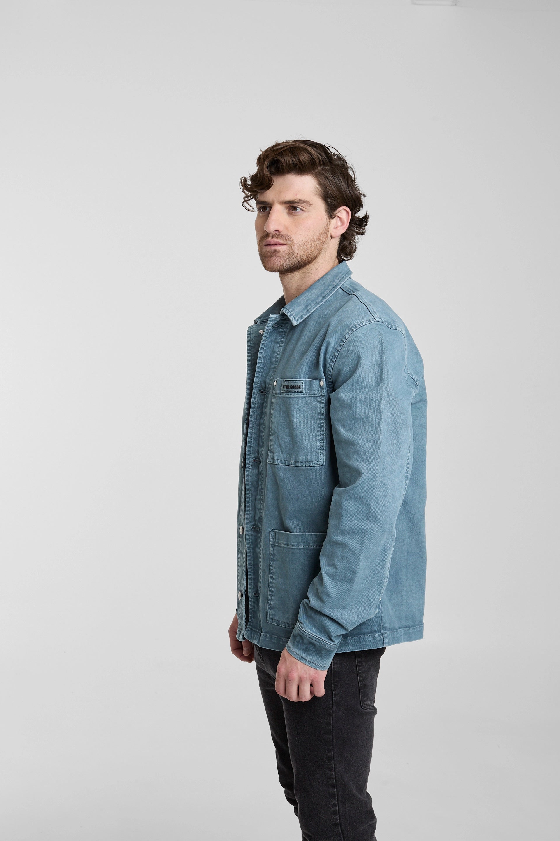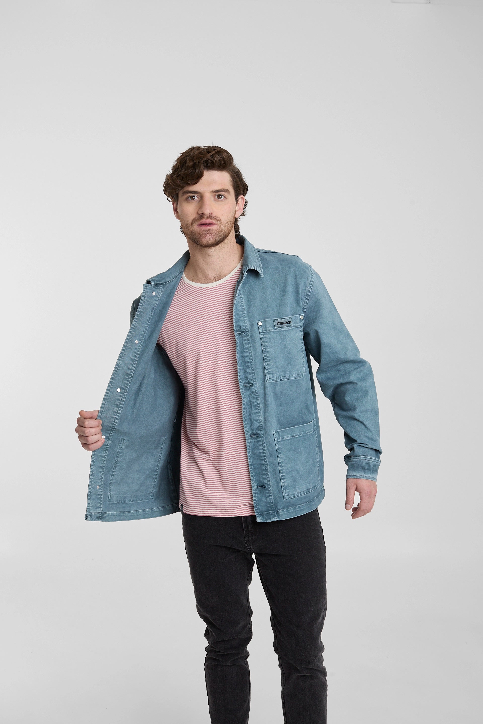Chaqueta tipo workwear unisex. Tiene botones metálicos en el delantero y puños, remaches metálicos en bolsillo pecho y mangas, 3 bolsillos sin tapa y cuello camisero.