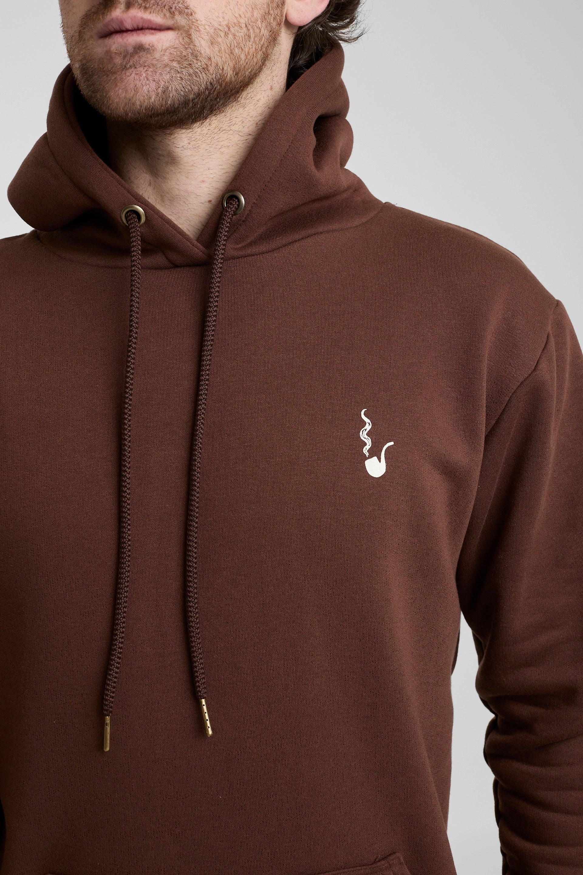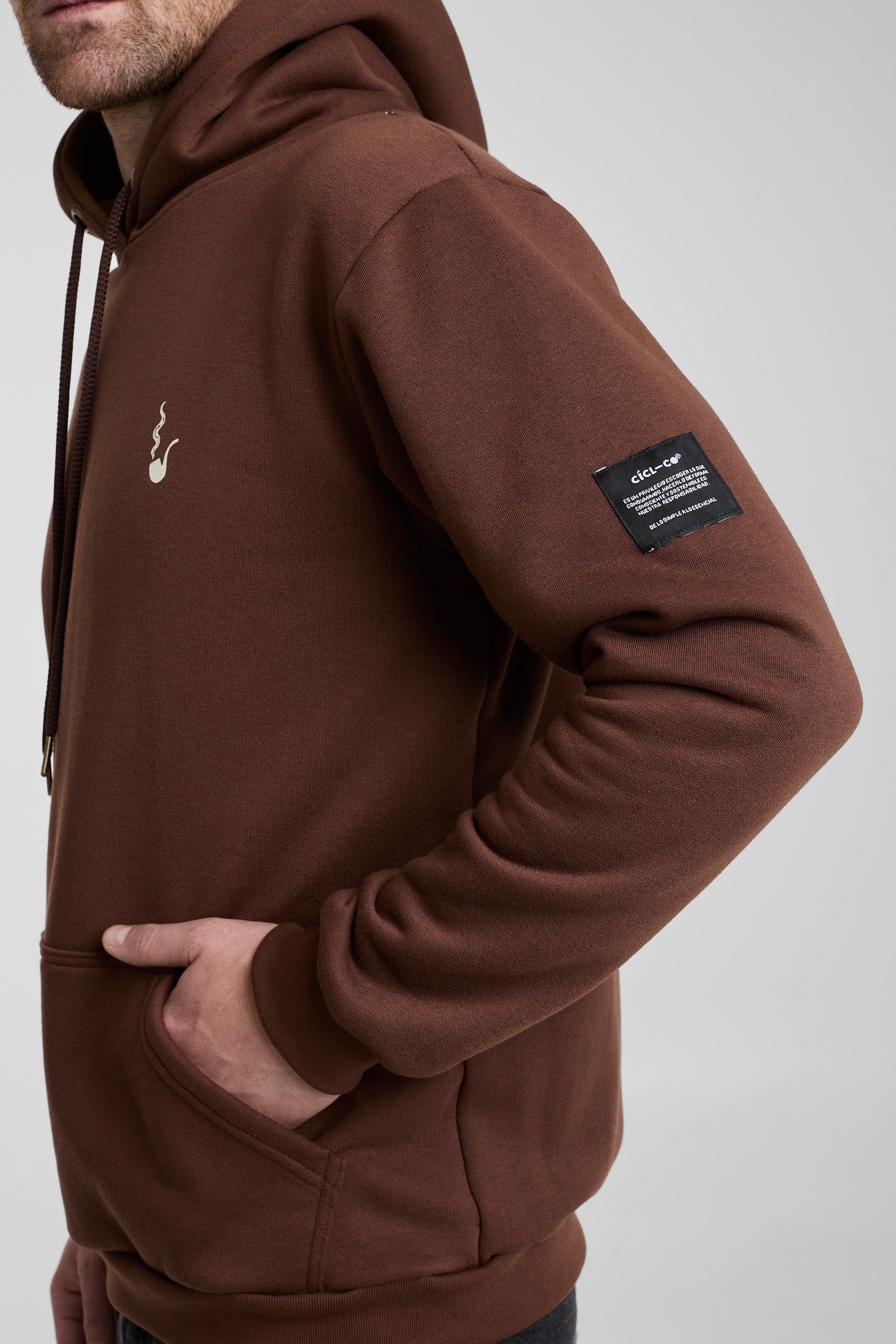 Hoodie con capucha color café estampado en serigrafía en espalda y pecho.