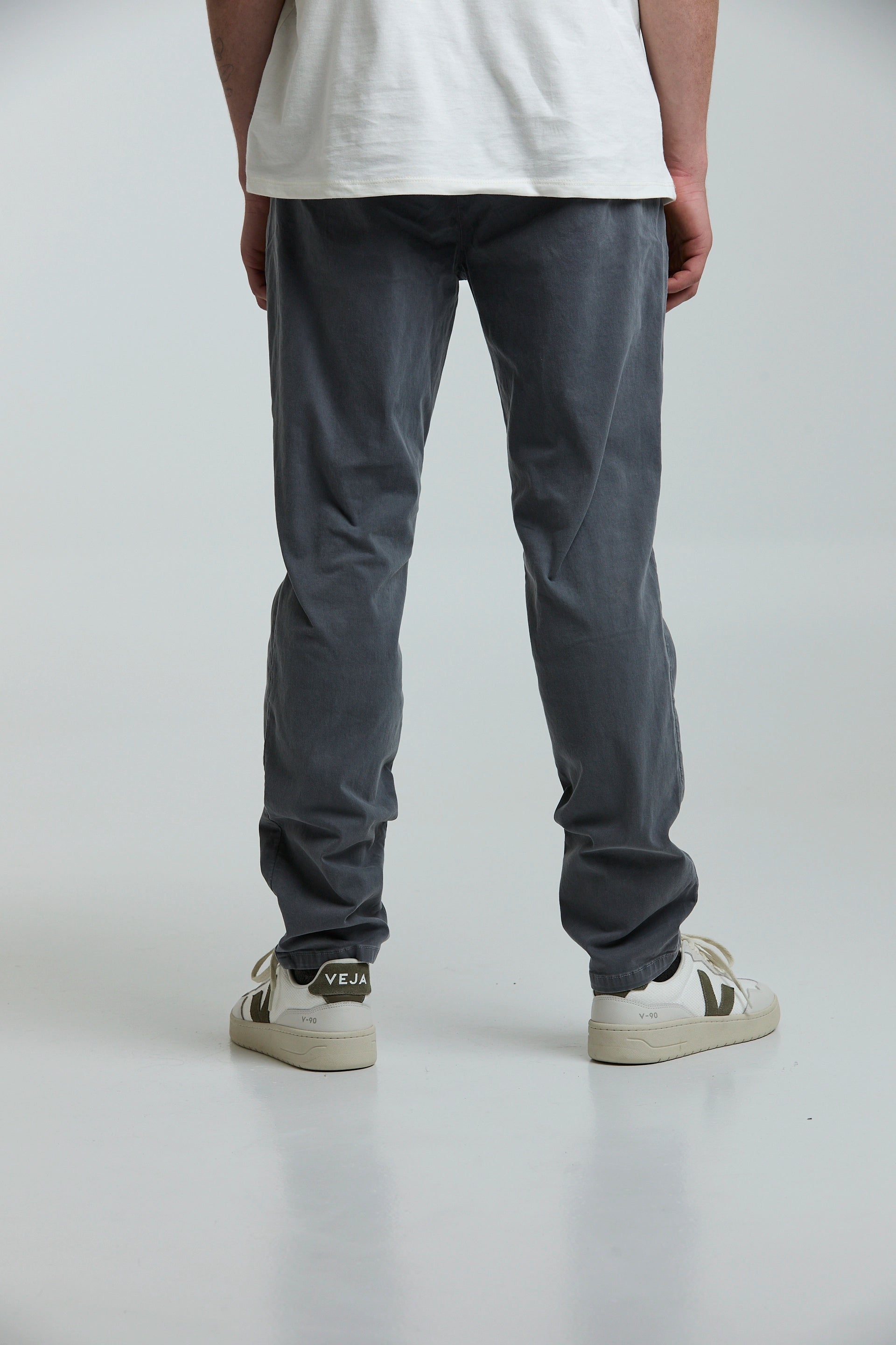Pantalón Chino (drill) tiro medio, bolsillos de ribete funcionales, ajuste en la cintura con botón.